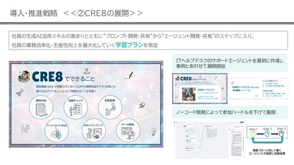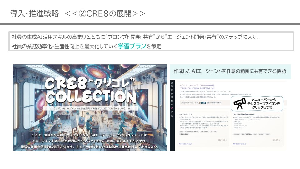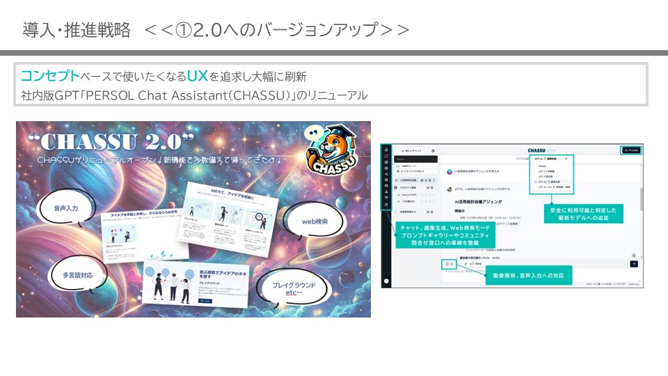 2024年12月にはUXを刷新した「CHASSU 2.0」を、2025年1月にはノーコードでAIエージェントを開発できる「CHASSU CRE8(チャッス クリエイト)」をリリースし、グループ社員のAI活用の幅をさらに広げています。