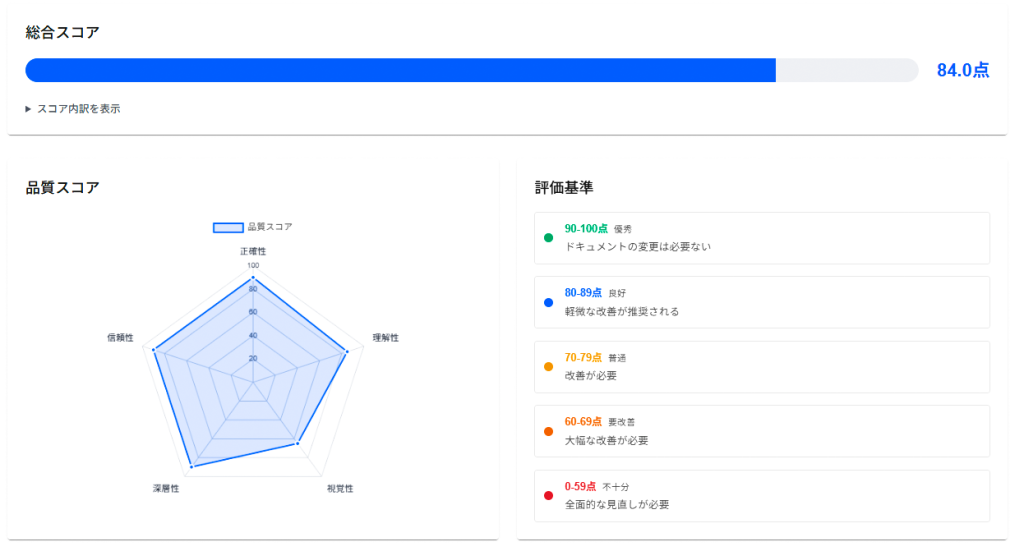 「QuintSpect®」にドキュメントを読み込ませるだけで、「正確性」・「理解性」・「視覚性」・「深層性」・「信頼性」の5つの観点で分析して指摘点を出してもらえるのですが、問題点だけでなく「どう改善すればいいのか」までが提示されるところが非常に便利だなと思います。